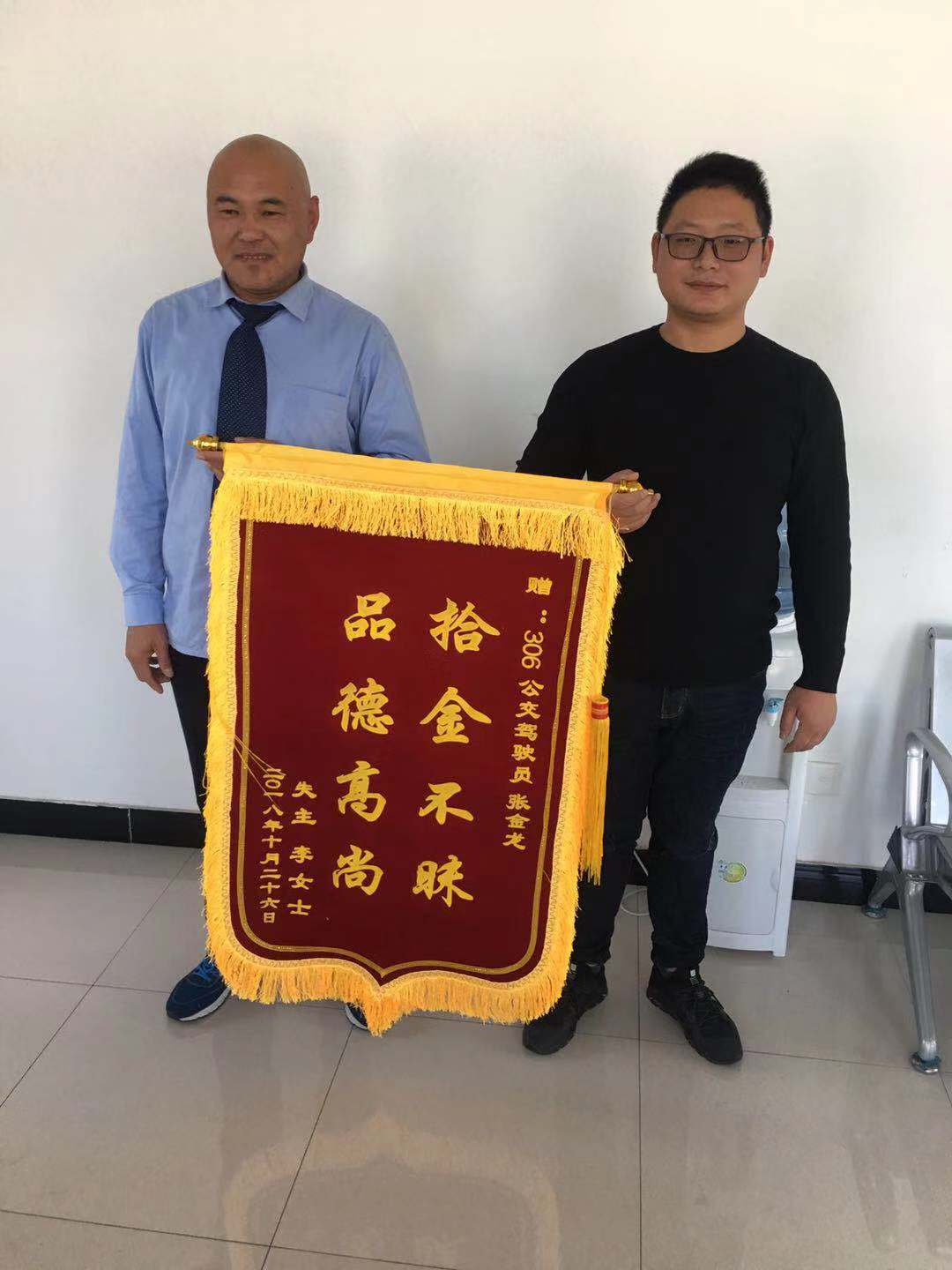 一直等到上午11點(diǎn)多,錢包的失主才打電話過來詢問,失主得知錢包沒有丟失時非常激動,下午1點(diǎn)多,拿回失而復(fù)得的錢包后,失主李女士喜不自禁,感謝連連,第二天專門定制了一面“拾金不昧”錦旗親手送給張金龍師傅。