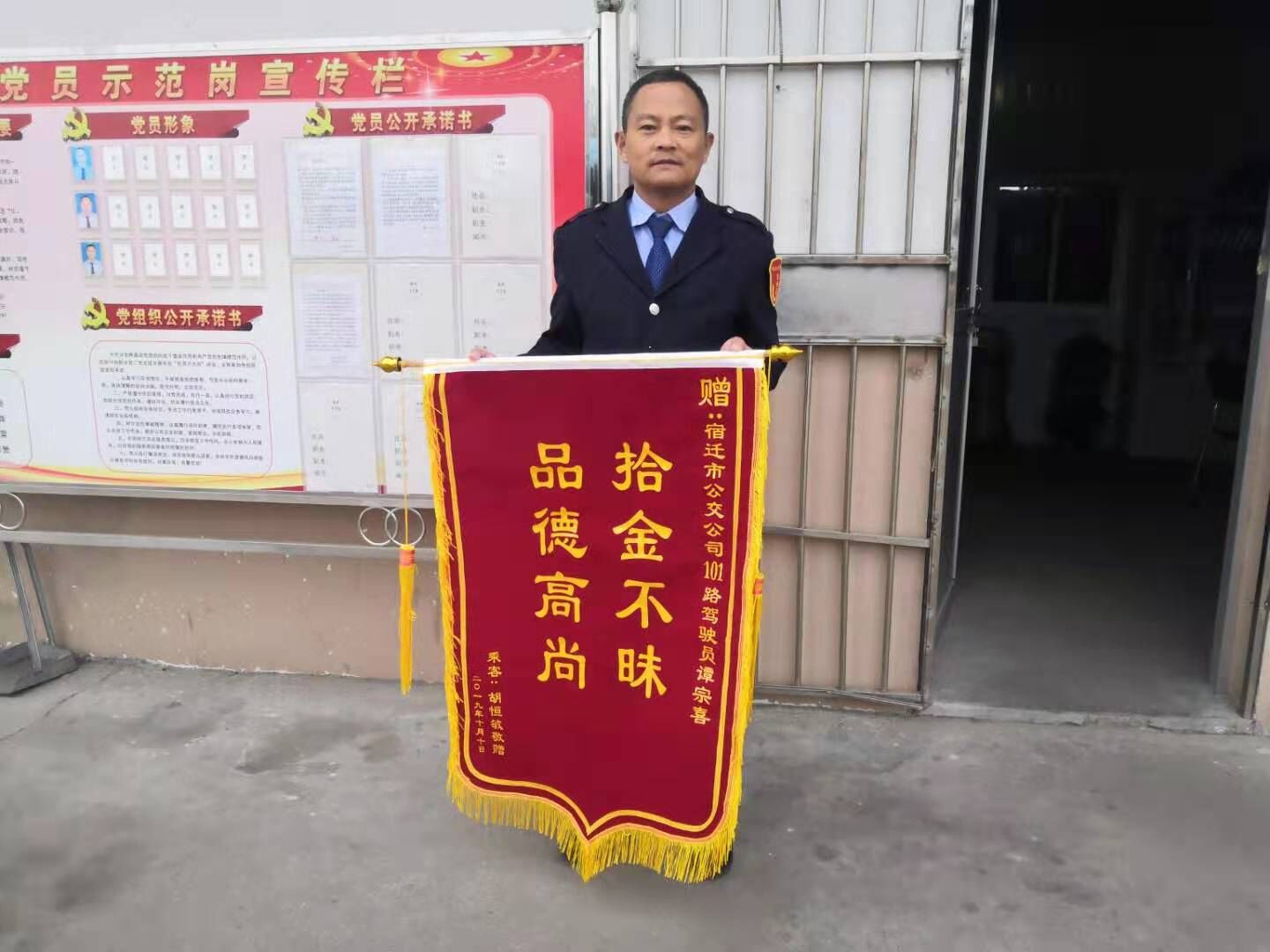 10月14日,財茂城調(diào)度站又迎來了一面鮮艷的錦旗。在這個擁有著退伍軍人組成的“西楚清風(fēng)號”車隊的優(yōu)秀調(diào)度站內(nèi),錦旗已經(jīng)掛滿了整個墻面,成了名副其實的“光榮墻”。“拾金不昧,品德高尚”八個鎏金大字是對該調(diào)度站所有優(yōu)秀駕駛員的褒獎。101路駕駛員譚宗喜也用自身的行動為這面光榮墻增添了濃墨重彩的一筆。