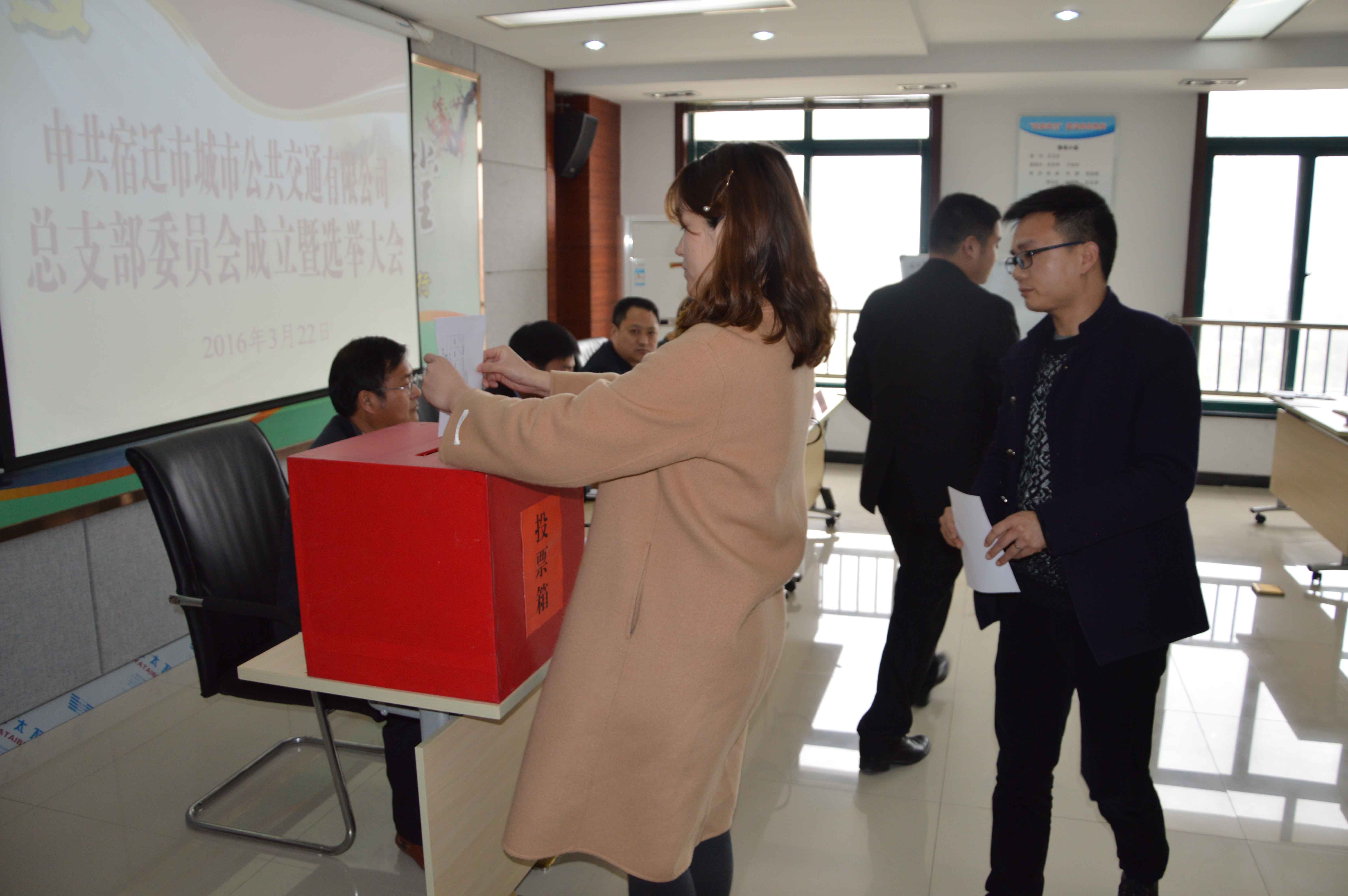 大會在《國際歌》中開幕,汪衛(wèi)東同志首先代表上屆黨支部作了籌備工作報告,張健同志宣讀了《關(guān)于同意召開中共宿遷市城市公共交通有限公司總支部委員會成立暨選舉大會的批復》和候選人簡歷。隨后,大會現(xiàn)場通過了《選舉辦法(草案)》和監(jiān)票、計票、唱票等工作人員。根據(jù)黨章和中國共產(chǎn)黨基層組織選舉工作暫行條例的有關(guān)規(guī)定,大會差額選舉產(chǎn)生汪衛(wèi)東、盧裕松、吳國旗、張健、楊威等5名同志為第一屆黨總支委員。黨總支委員會召開了第一次支部委員會議,選舉汪衛(wèi)東同志為黨總支書記,并對總支委員進行分工,盧裕松同志任組織委員、吳國旗同志任紀檢委員、張健同志任宣傳委員、楊威同志任青年委員。